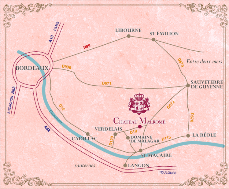 马尔罗庄园位于波尔多六个行政区域中右下角的 ENTRE-DEUX-MERS 两海之间,位处圣安得烈.德.博尔市镇上(多尔多涅河及加龙河的流域之间)。它跟邻近著名的滴金酒庄一样,座落于青山,绿地及葡萄藤环绕的幽谷地带。